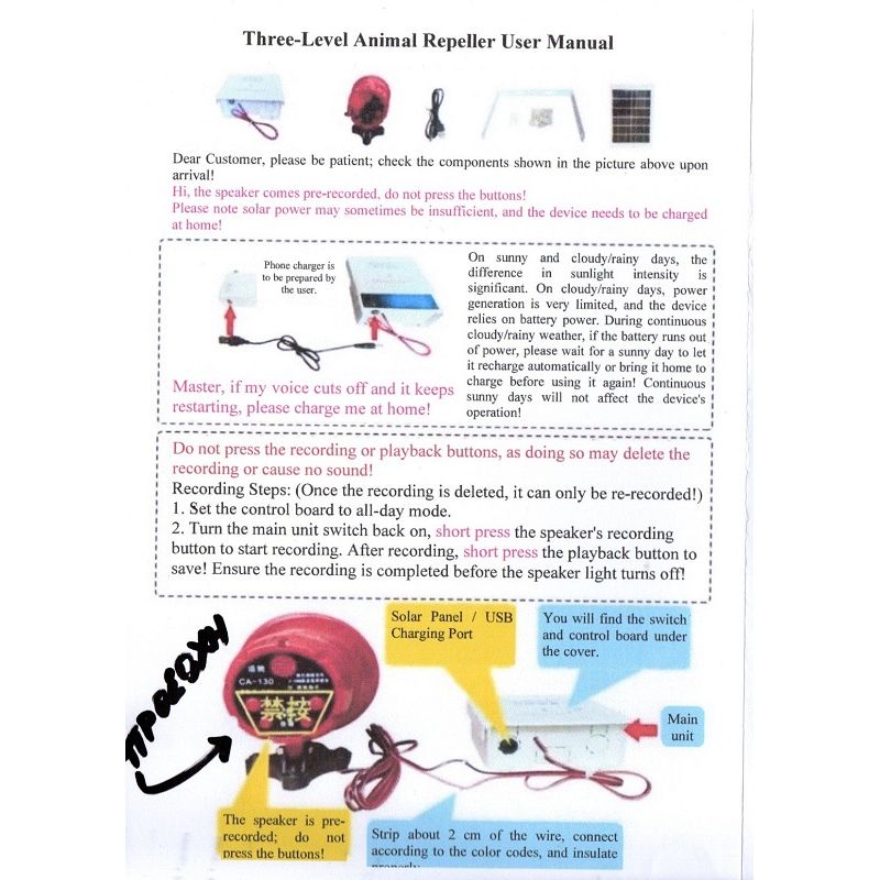 Η συσκευή Ηλιακό Απωθητικό Πουλιών με Ήχους; για απομακρύνει τα πουλιά και μικρά ζώα, χρησιμοποιεί την δύναμη των φυσικών ενστίκτων επιβίωσης των πουλιών. Οι ψηφιακές ηχογραφήσεις πουλιών υπό σύγχυση, ανησυχεί τα πουλιά και μαζί με τους ήχους των φυσικών εχθρών τους, που αναπαράγονται μέσω της υψηλής πιστότητας ανθεκτικό στις καιρικές συνθήκες ηχείο.